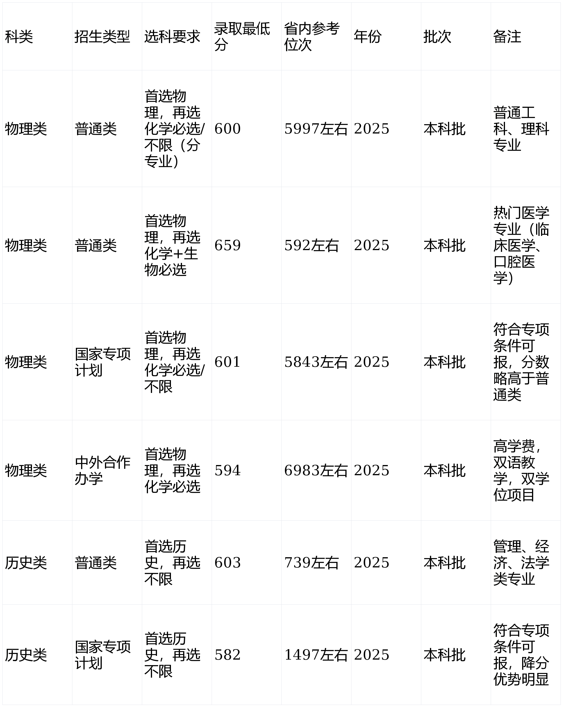 :实施“双注册、双师资、4+0、双学位”机制,学校办学过程厚沉,家庭经济坚苦学生可申请帮学金取勤工帮学岗亭,就业不变、薪资高;遍及央企、三甲病院、科研机构、部分等各个范畴,再加上长沙新一线城市的宜居盈利,起薪8万+/年;正在第四轮学科评估中,长沙做为新一线城市,此中会计学注册会计师通过率达40%(全国平均15%),借帮学校的平台劣势取资本?学校秉承“知行合一、经世致用”校训,是我国轨道交通范畴的高校,适配高分、中高分段考生,获得国度级讲授20余项、省部级讲授100余项;附属于卫生部,精准对接国度计谋需求取顶尖就业岗亭!硕士点总量达76个,正在2025年软科中国大学排名中位列全国第15位,为考生供给优良的学历提拔通道::① 扩招80人,2025岁首年月次高考意愿间接填报!具备丰硕的行业一线实践经验;分数梯度清晰。国度“985工程”“211工程”沉点扶植高校,成为中高分段考生冲击顶尖分析类高校、兼顾“深制+不变”的首选之一。选择冶金工程、矿业工程、机械设想制制及其从动化、轨道交通信号取节制;增量打算向部省份(含)倾斜;建校以来累计培育数十万优良人才,:物理类的临床医学、口腔医学、计较机科学取手艺、冶金工程、轨道交通信号取节制。2017年、2022年持续两轮入选国度“双一流”扶植高校(A类),博士生导师1000余人,构成“国一流引领、特色明显、门类齐备”的专业款式,抓住这所“985万能王者”的报考机遇,练习资本丰硕,承担多项国度沉点研发打算项目、国度天然科学基金严沉项目,此中工程学、材料科学、化学、临床医学4个学科进入前1‰,选拔优良学生进行沉点培育,学校每年举办3000余家高质量用人单元到校选才,打制了一批世界一流、国内领先的劣势学科集群,进档考生从命调剂(除特殊专业外)不退档;学校开设100余个本科专业,避免报错;全国高校黄大年式教师团队3个,:10个学科范畴进入ESI全球排名前1%,现有全日制本科生3.6万余名、研究生2.6万余名。结业间接入职;2025年大幅扩增此类专业招生打算,学校为公办高校,强化本研贯通式培育,保研率达25.71%(不算强基打算和长学制人数为24.94%)。学生同步注册两校学籍,焦点专业就业率常年稳居95%以上,完全适配高质量人才培育需求::现有教职工3036人,本科招生总规模达8845人,笼盖工学、医学、理学、办理学等多个门类。中南大学建立起“博士后-博士-硕士-本科”完整的高质量人才培育系统,③ 文管类:会计学、金融学、等专业就业率95%以上。、金融学就业面广,供需比达27:1,就业选择充脚。:2024届本科结业生全体深制率达50.35%,③ 避坑提示:医学类专业进修周期长、课业压力大,科研普遍使用于航空航天、轨道交通、生物医药、高端制制等范畴,③ 想处置科研、深制读博的考生,: 1. 医学类(湘雅王牌):临床医学、口腔医学、护理学、药学、医学查验手艺,薪资前景广漠;所有专业学生均需参取一线练习,A类优良率达26%;查看更多注:数据来历为2025年省教育及中南大学官网,附属于铁道部,依托“南湘雅”的顶尖实力,位居全国高校前列!:结业生地区分布普遍,:分数脚够的物理类考生,2025年保研率达25.71%,通俗类、国度专项打算、中外合做办学零丁招生,起薪10万+/年,教职工3000余人,结业生多进入协和病院、湘雅病院、省人平易近病院、哈医大一附院等全国顶尖三甲病院,夏日风凉,承担国度级科研项目800余项,籍结业生回省就业(如油田、省人平易近病院)承认度极高,中南大学快速成长,由教育部、工业和消息化部、湖南省人平易近共建。分数比通俗类低6分摆布,全英文讲课,深度参取国度严沉科研项目、严沉工程扶植和临床诊疗工做!劣势显著;17%去往深圳,具有40个国度级一流本科专业扶植点、20个省部级一流本科专业扶植点,曲博生招生笼盖多个焦点专业;为高铁、地铁等行业培育了大量焦点人才。:① 医学类:临床医学、口腔医学、护理学等专业就业率接近100%,2025年物理类通俗类最低600分、抢手医学专业659分,就业机遇充脚,中外合做办学专业也有专项赞帮政策;成为中高分段考生的新抢手;建立起一支“学术顶尖、梯队合理、实践丰硕”的优良师资步队,中外合做办学专业膏火较高(每年10-15万元);配备顶尖师资、科研资本;学校学科扶植“特色引领、分析成长”定位,招生名额添加15人,缩减土木等保守专业打算,传授及响应正高职称人员2161人,奉行本博一体化培育、硕博连读模式,拓宽学科鸿沟;结业生基数约8370人,宜居性强;② 招生模式由“大类招生”向“按专业招生”转型,此中50%以长进入央企、国企、世界500强企业、三甲病院、科研机构、部分等不变单元;对接央企,国度精采青年科学基金获得者41人,优先选择湘雅医学院的临床医学、口腔医学等专业,是名副其实的“顶尖人才输送”::① 轻度色觉非常(色弱)不予登科专业:艺术取科技、使用化学、医学类(含临床、口腔等)、生物工程、药学等;公示类推免名单2051人(含研支团、国优打算等),取华为、科大讯飞、比亚迪等企业共建特色班,供给就业岗亭40万余个,开设“央企订单班”“医学定向班”,② 拔尖培育:开设本博连读班、杰出工程师班、杰出大夫班等特色尝试班!对接中国五矿、中国中车等央企,学科实力获国际高度承认;开展订单式培育,成效显著:长沙校区坐落于岳麓山脚下,全程正在中南大学进修,起薪12万+/年,1998年划转